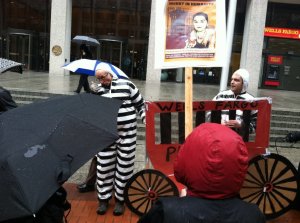 Jamie Patridge and Sean Staub wore prison-striped jumpsuits and held a cardboard recreation of the red Wells Fargo stagecoach to connect the bank with the private-prison companies. Partridge, of Northeast Portland, also had a personal stake in the bank’s lending practices.