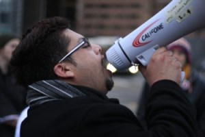 Members of PAZ led a rally on the steps of St. Cajetan’s Center where they shouted warnings against joining Wells Fargo. Along with Bermudez, several speakers shared poems and stories of how Wells Fargo worked to separate families.