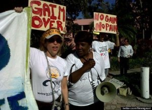 According to Cervantes-Gautschi and fellow demonstrator Veronica Castro, Miller, Daiagi, and Purvis were arrested after two separate actions of protest: one inside the Boca Resort at a GAIM meeting, during which a demonstrator stood up to call for an end to investment in private prisons, and another that unfolded on the hotel’s lawn as conventioneers moved between gatherings.