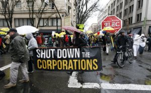 Along the way, demonstrators went into the downtown McDonalds, stopped at the Verizon outlet on Southwest Broadway and circled the Wells Fargo Center to demand that those companies and others withdraw from the council – which writes model legislation that leans right politically.