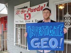 - Libal, shown at a protest over conditions at a federal immigrant detainee center: GEO’s poor record “makes me wonder how they will operate a state mental institution.” Courtesy Bob Libal