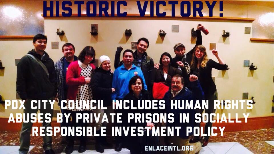 Portland, Ore –. Portland City Council voted today to implement a Socially Responsible Investment (SRI) policy that will consider corporate abuses of human rights, such as those committed by the GEO Group which operates the Tacoma, WA Northwest Detention Center. The policy will be overseen by an appointed citizen committee that will be “reflective of the diversity of…Portland.” The human rights and diversity provisions were both requested by Voz and Enlace.