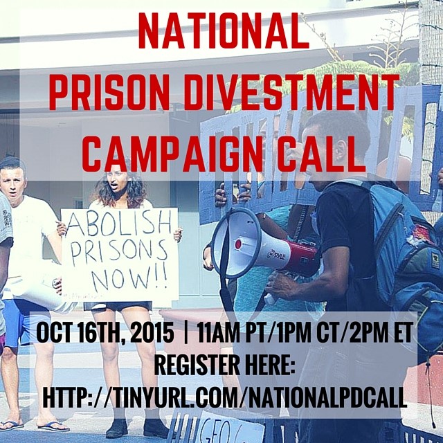 We are inviting you to join us for the VERY FIRST National Prison Divestment call on October 16th, 11am PT/1pm CT/2pm ET. This is intended to be an active space for #PrisonDivest organizers across the country to share experiences, troubleshoot any challenges, and access resources to strengthen their campaigns.