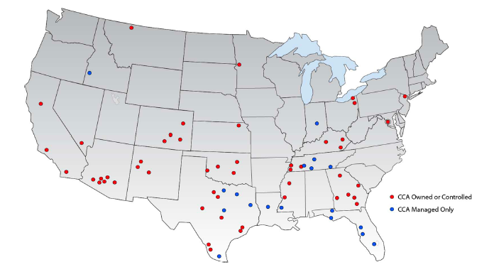 Corrections Corporation of America (CCA) is the largest for-profit prison company in the U.S.. In May 2013, CCA boasted that they are the “clear leader of private prisons, controlling approximately 44% of the private corrections and detention beds in the United States.” CCA operates 69 correctional and detention facilities, including 49 that it owns, in 20 States and the District of Columbia.
